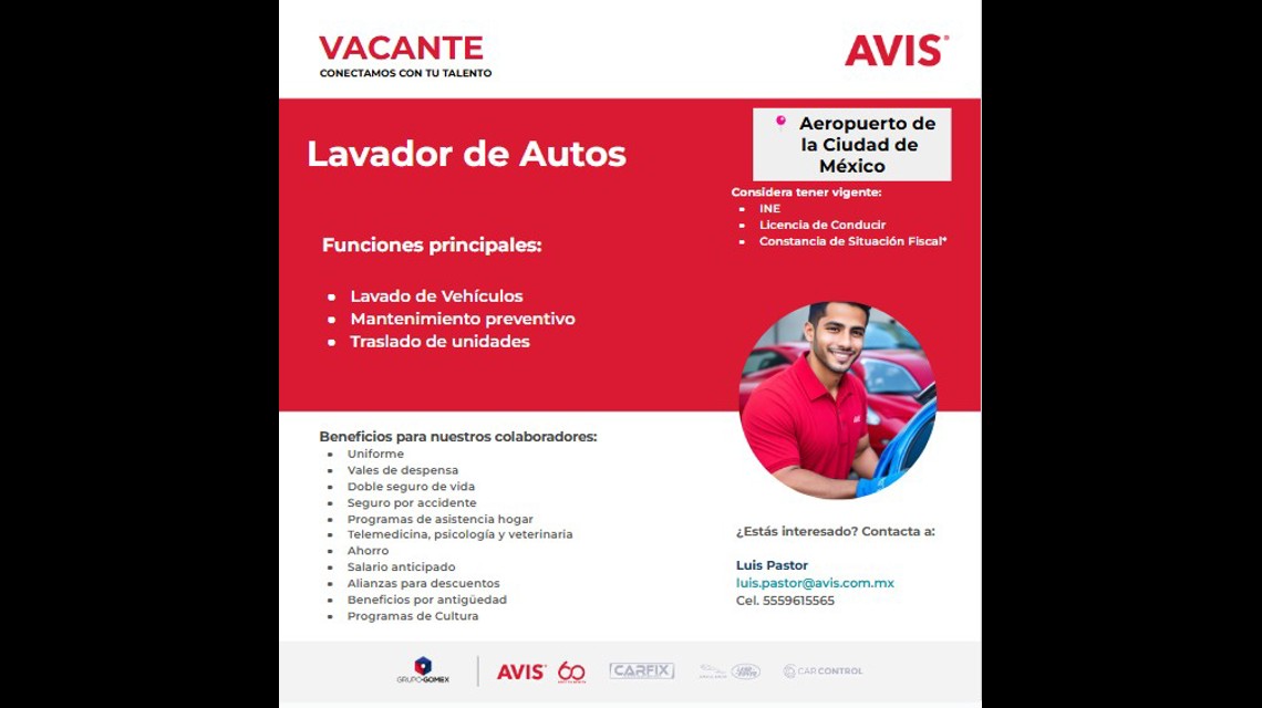 AVIS Renta de Autos está contratando Agente de Servicio (lavado, entrega y recepción y traslado de autos).